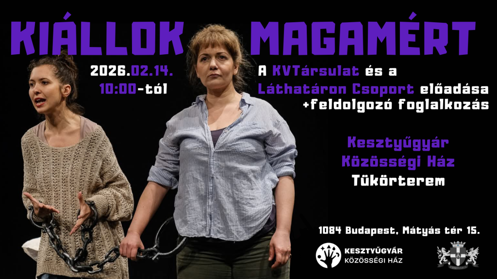 Február 14-én ellátogat hozzánk a KVTársulat és a Láthatáron Csoport a Kiállok magamért című színdarabbal. A színházi előadás első sorban gyerekeknek, fiataloknak szól, a 60 perces színdarabot 45 perces feldolgozó foglalkozás kíséri. Helyszín: Kesztyűgyár Közösségi Ház, Tükörterem (1084 Budapest, Mátyás tér 15.) A program ingyenes, de regisztrációhoz kötött:Regisztrálni személyesen a Kesztyűgyárban, nyitvatartási időben, vagy e-mailben…
