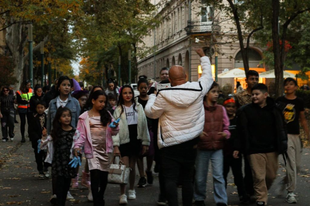 Sötétedéskor a jelmezbe öltözött gyerekek felsorakoztak, hogy körbe vonuljunk Mátyás téren. A tavalyi Halloween-bulin közösen megírt verset skandáltuk és természetesen mindenki kapott egy rémisztő csomag édességet is.