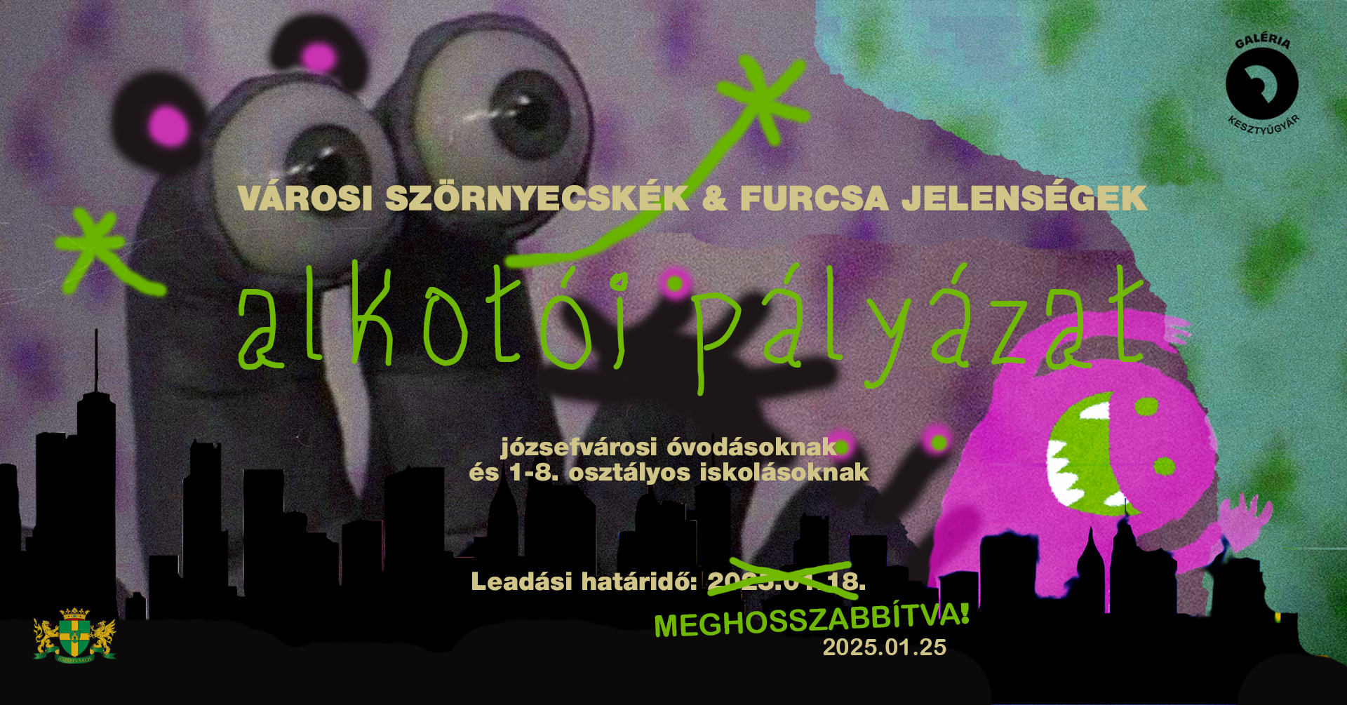 A Kesztyűgyár Galéria vizuális művészeti pályázatot hirdet “városi szörnyecskék, képzeletbeli lények” témában, két kategóriában: józsefvárosi óvodás és 1-8. osztályos tanulók számára. Az alkotás bármilyen sík-, térbeli, vagy akár digitális technikával is készülhet, lehet fekete-fehér vagy színes (pl. rajz, festmény, kollázs, videó, fotó, installáció, báb, stb.). Nem csupán egyéni munkákat várunk, csoportosan is készíthetnek alkotásokat a gyerekek.